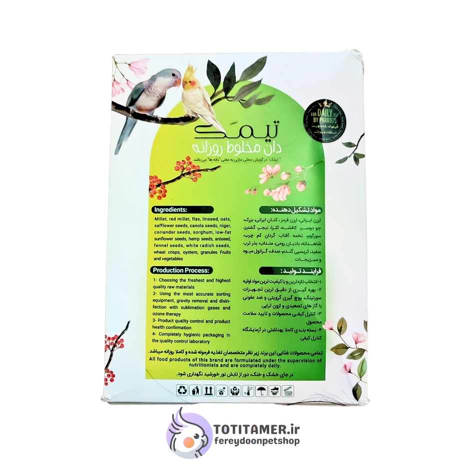 | دان ها: | ارزن،ارزن قرمز،بذر کتان، بزرک، جودوسر، کافشه، کلزا، نیجر،بذر ترب سفید، گشنیز،تخمه دور سفید،شاهدانه،گندم برشته،رازیانه، صدف، سورگوم،منداب و در اخر گرانول میوه و سبزی |